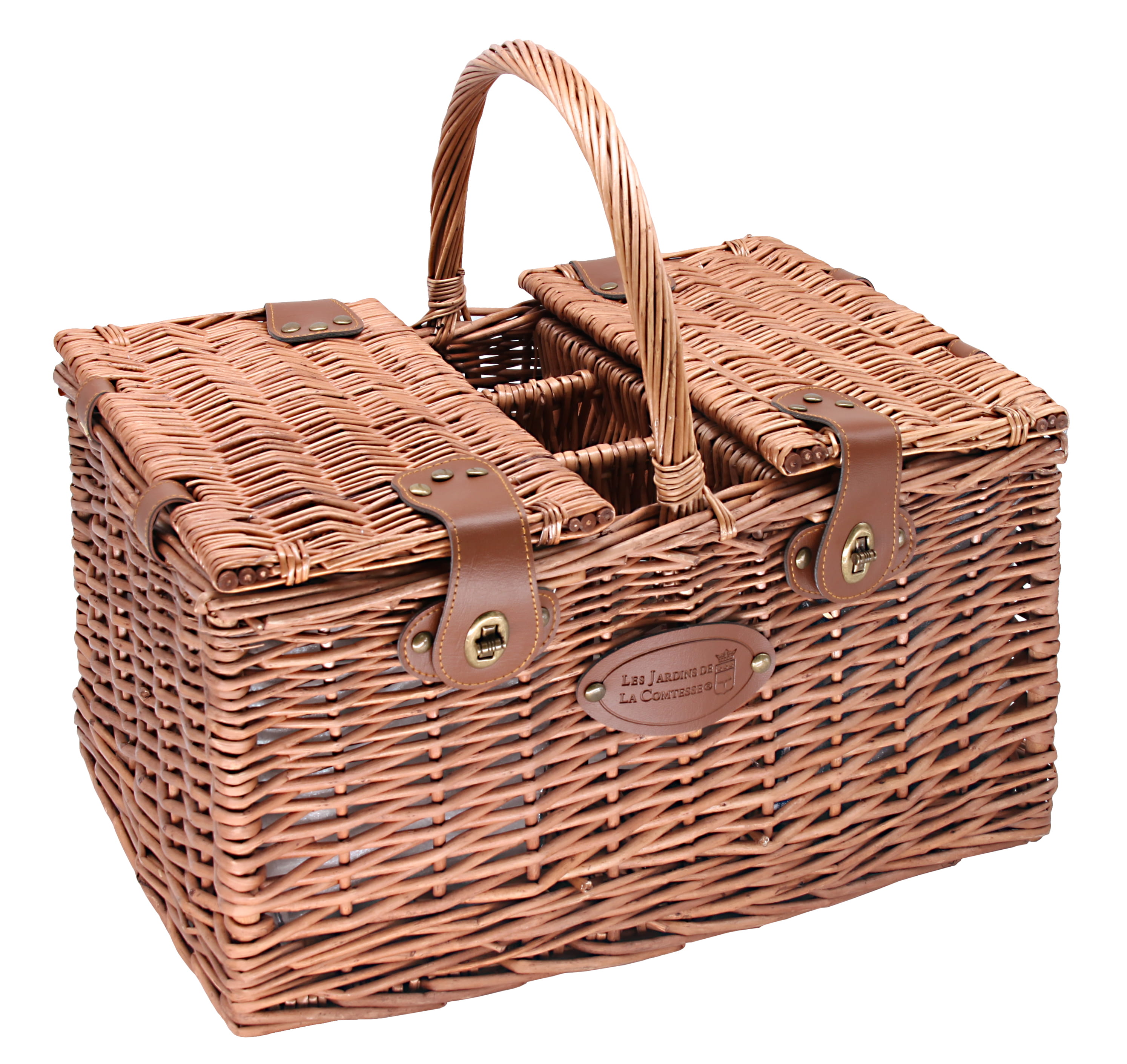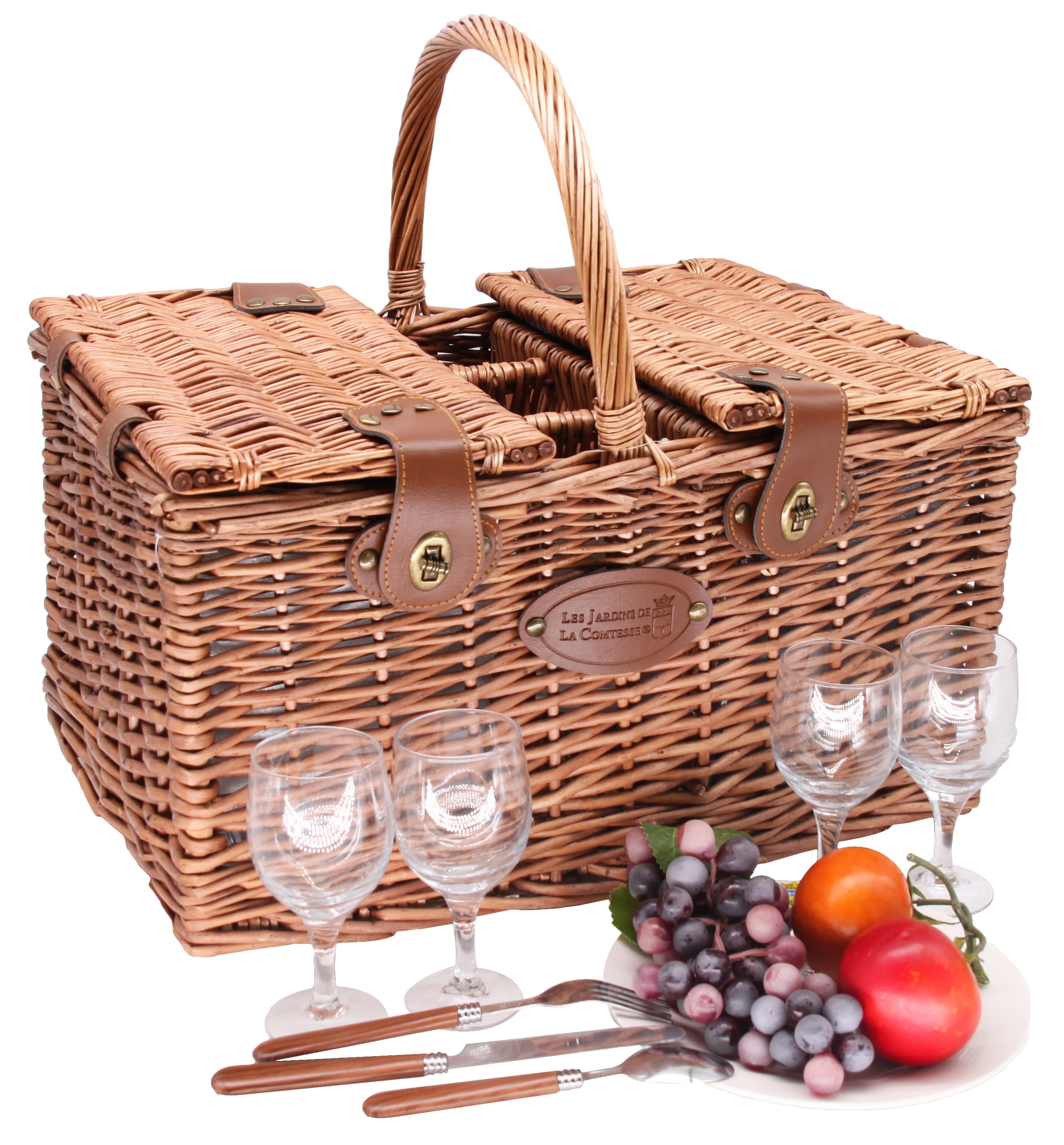 Dieser Picknickkorb überzeugt durch seine hochwertige Verarbeitung, die komplette Ausstattung und das durchdachte Design. Er nimmt Ihnen die Vorbereitung ab, da alles bereits enthalten und perfekt organisiert ist. Schick und funktional ist der Korb in zwei Bereiche unterteilt: Ein isoliertes Kühlfach hält Speisen frisch, während im anderen Fach Teller und Gläser sicher mit Kunstlederriemen fixiert sind. Das übrige Zubehör für vier Personen – Besteck, Kellnermesser sowie Salz- und Pfefferstreuer – ist praktisch in den Deckeln verstaut.